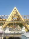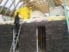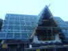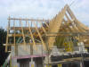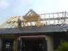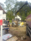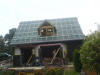 Heute wurde das Dach gerichtet. Als ich um 8 Uhr zu Baustelle kam, waren schon die Fuß- und Mittelpfetten sowie die Abschließenden Sparren mit Kehlbalken gesetzt. Ein Wahnsinns Tempo die Zimmerleute ! Es wurden per Autokran die restlichen Sparren und anderen Verstrebungen auf die Decke gehoben, und anschließend per Hand montiert. Der Dachstuhl wurde mit Rispenband gesichert und mit Unterziehbahn "dicht" gemacht. Im Außenbereich wurde weiter fleißig an der Klinkerfassade gearbeitet. Anschließend gab es ein zünftiges Richtfest nebst obligatorischen Richtkranz, der freundlicherweise von der neuen Nachbarschaft gebunden und gestiftet wurde. Noch mal Danke an alle !