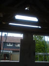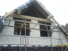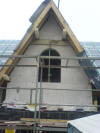 Heute Freitag der 13te. Aber keine Bange. Alles läuft gut. Keine Schreckens- nachrichten. Es wurden heute die drei Giebelwände gemauert. Im Friesengiebel wurde das halbrunde Fenster vorgesehen, in den anderen beiden die normalen Zimmerfenster. Am Abend hat dann auch die Bauherrin die obere Etage be- treten, und war begeistert. Zu einem vom Fortschritt, und zum anderen von der Aussicht und dem Aussehen des Giebelfensters im Fries.