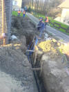 Heute wurden nun endlich die Hausanschlüsse hergestellt. Wasser, Gas, Strom und Telekom. Es wurden die neuen Leitungen an die vorhandenen im Bürgersteig angeschlossen, so wie diverse Absperrhähne und Schieber gesetzt. Im Hauswirtschaftsraum kommen nun die ganzen Leitungen hoch ins Haus, und enden dort in den jeweiligen Übergabekästen der Versorger. Wenn nun die nachgeschalteten Anlagen wie Heizung, Elektro etc. fertig sind, können auch noch sie Zähler gesetzt werden. |