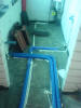 Heute wurde von der Firma Wielu die restliche Wasser-, Abwasser und Heizungsrohre im Erdgeschoss verlegt. Außerdem war Firma Thoben da, und hat die Außenfensterbänke bei den Bodentiefen Fenstern als Rollschicht angelegt. Es wurde rund um das Haus schon mal ein wenig Ordnung gemacht, und das Gerüst abgebaut. So hat man nun zum ersten mal richtig freien Blick auf das von außen fast fertige Haus. Einfach nur hübsch !!!! Die Innenbilder haben jetzt leider alle ein wenig Blaustich, da auf den Fenstern schon Folie zum Schutz vor den Putzarbeiten ist. Und diese ist nun mal blau. |