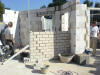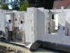 Gestern und heute wurde fleißig geschafft. Im Erdgeschoss sind fast alle Wände fertig gemauert. Es wurden die Stürze in die Türen gelegt, die Rollladengurtkästen gesetzt und einige Einschalungen für Stützpfeiler errichtet. Außerdem wurde die Sohleplatte und unterste Steinreihe mit Schwarzanstrich gegen Feuchtigkeit versiegelt.