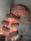 Heute und gestern war die Putzkolonne der Firma Hanekamp da. Die haben im gesamten Haus die Wände verputzt. Es wurden ca. 6,5 qm Sand angefahren, die dann mit den entsprechenden Zutaten in der "Mischmaschine" vermengt wurden, und mit der Putzpistole an die Wand geworfen wurden. Nun sind alle Wände schön eben. Am Abend habe ich dann noch die Leerrohre mit den Elektrokabeln ein wenig geordnet, damit die nicht so kreuz und quer über den Fußboden laufen. |