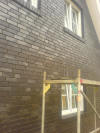 Heute durfte man nun den Estrich betreten. Ich bin erst mal in das Haus und habe mir alles genau angesehen. Eine, für mein Auge, gute Arbeit. Nur das wichtigste hat man vergessen. Im Wohnzimmer sollte der Estrich etwas tiefer sein, um den Höhenunterschied des Parketts zur Küchenfliese auszugleichen. Doch der Estrich ist eben. Keine Kante, kein Absatz. Nun muss sich der Estrichbauer überlegen, ob er was abfräst, oder die restlichen Bereiche noch etwas höher zieht. Außerdem waren die Verfuger da. Sie haben damit begonnen den Klinker abzusäuern, um ihn so vom Zementschleier und Dreck zu befreien. Nun kann man ihn auch erstmals in seiner ganzen Farbevielfalt sehen. Wird immer schöner. Zum Schluss hat man uns noch zwei Fugenfarbmuster angebracht. Wir haben uns für die Dunklere (rechte) ent- schieden. Bei der Hellen hatten wir die Befürchtung, dass das Haus zu "bunt" wird. Obwohl bei der hellen Fuge der Stein schon besonders gut zur Geltung kam. |